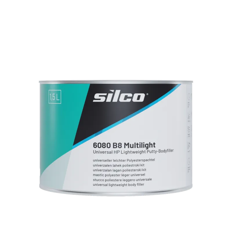 ➡️ SILCO 6080 B8 Multi-Light to lekka, wysokowydajna szpachlówka poliestrowa, zaprojektowana do efektywnego wypełniania wgnieceń i nierówności przy użyciu znacznie mniejszej ilości materiału wagowo w porównaniu do tradycyjnych szpachlówek. Dzięki niskiej gęstości oraz doskonałej przyczepności do trudnych podłoży, takich jak stal ocynkowana, elektro-cynk, aluminium i stal, produkt doskonale sprawdza się w nowoczesnych naprawach blacharsko-lakierniczych.